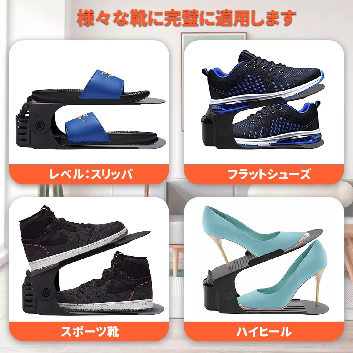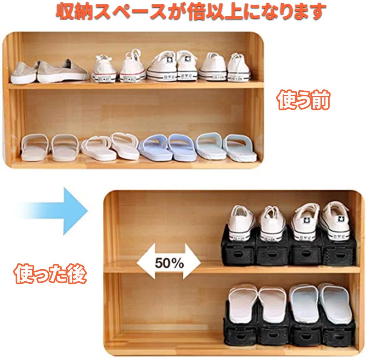 しかし、このシューズホルダーを使えば、デッドスペースが有効活用でき靴を重ねて収納できるので、単純に収納力が2倍に! また、シューズホルダーの角度が3段階で調整できます。