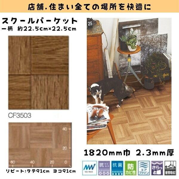 商品情報商品規格182cm幅 2.3mm厚品番一覧CF3503東リ ペット対応 クッションフロア CFシート NW 木目調 スクールパーケット 182cm幅 2.3mm厚 安心の抗ウイルス性能 消臭機能 防滑性 ワックスメンテ不要でお掃除かんたん 2