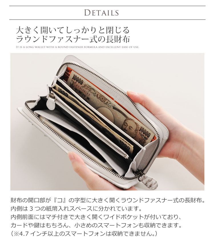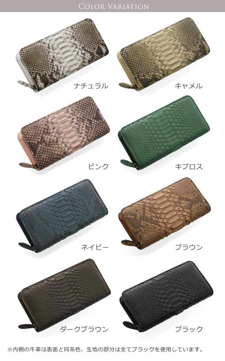 素材表側:ダイヤモンドパイソン内装:牛革(本革)、生地 原産国ベトナム(縫製) 内側収納・紙幣入れ×3・小銭入れ×1・カードホルダー×6・ワイドポケット×1・マチ付きワイドポケット×1 外側収納なし 開閉ラウンドファスナー式 備考マチ付きワイドポケットは横幅15.5cm、深さ7cmです。