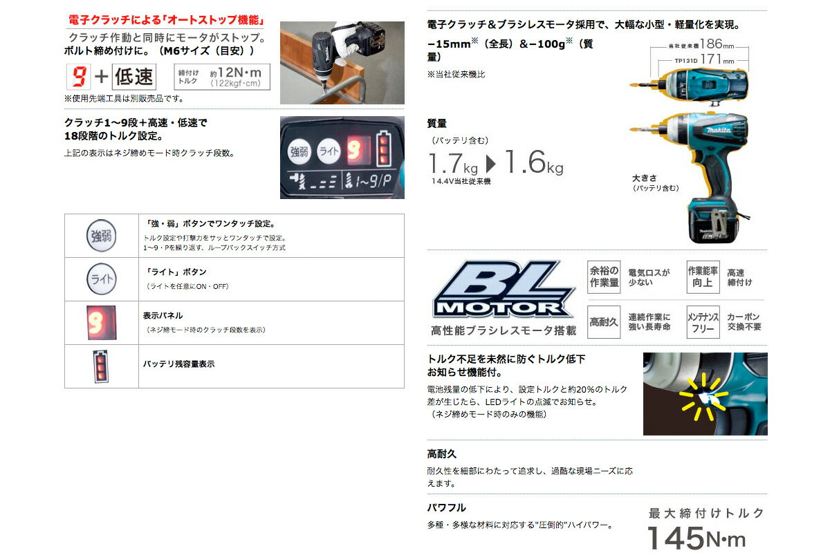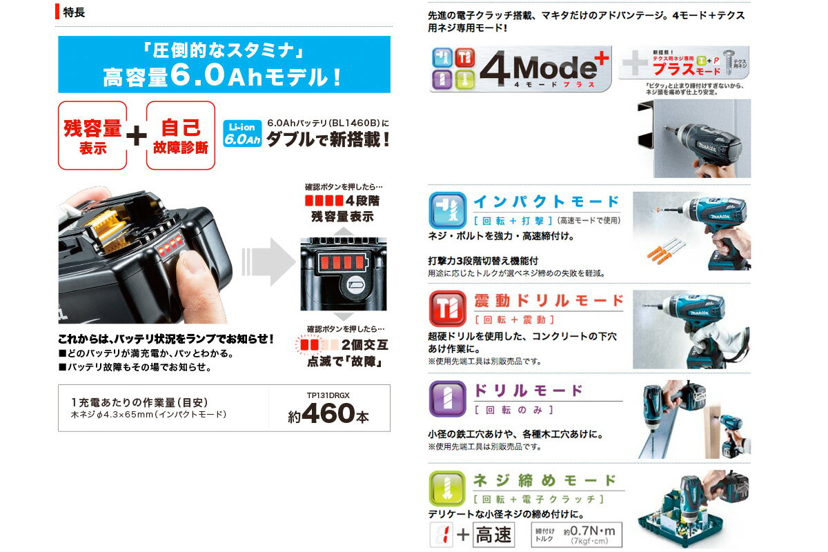◆圧倒的作業量「高容量6.0Ah」モデル登場! 4モード+テクス用ネジ専用モード付 ■ネジ締め能力 [インパクトモード時](小ねじ)M4〜M8、(普通ボルト)M5〜M14、(コーススレッド)22〜125mmm、(高力ボルト)M5〜M12 ■穴あけ能力: [震動モード時](コンクリート)8mmまで [ドリルモード時](鉄工)高速6.5mmまで・低速10mmまで、(木工)高速12mmまで・低速21mmまで ■回転数: [インパクトモード時]強0〜2800・中0〜2200・弱0〜1400 [震動モード時]高速0〜2800・低速0〜700 [ドリルモード時]高速0〜2800・低速0〜700 [ネジ締めモード時]高速0〜1100(設定数値により変化します)・高速0〜2300(プラス(P)モード時)・低速0〜300(設定数値により変化します)・低速0〜600(プラス(P)モード時) ■打撃数: [インパクトモード時]強0〜3200・中0〜2400・中0〜2400・弱0〜1200 [震動モード時]高速0〜32400・低速0〜8400 ■質量:1.6kg (バッテリ含む) ■本機寸法:長さ171mm×幅79mm×高さ250mm ■本体色:青・黒 の2色からお選び下さい ■標準付属品:6.0Ah容量リチウムイオンバッテリBL1460B×2台、充電器DC18RC、ケース、プラスビット2-65、フック