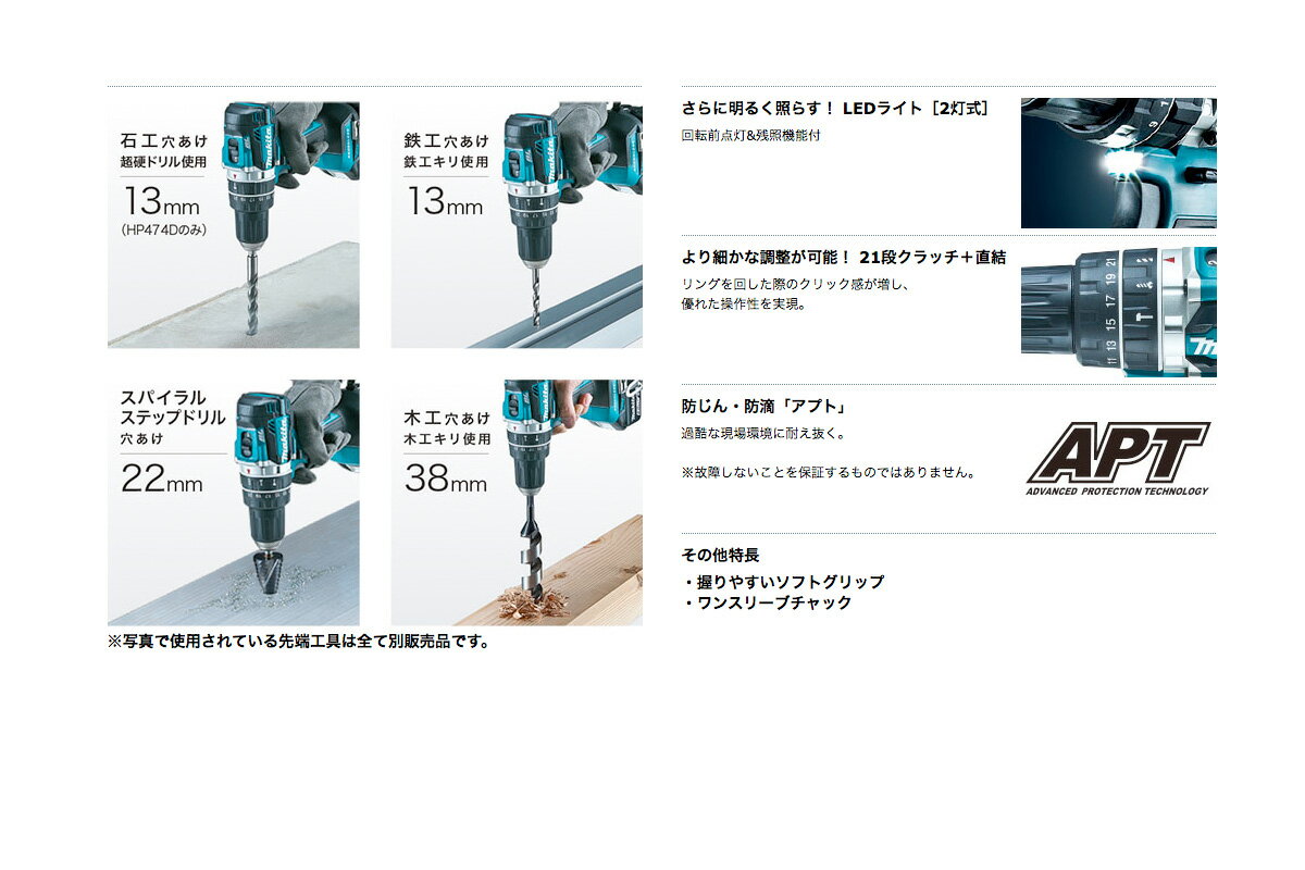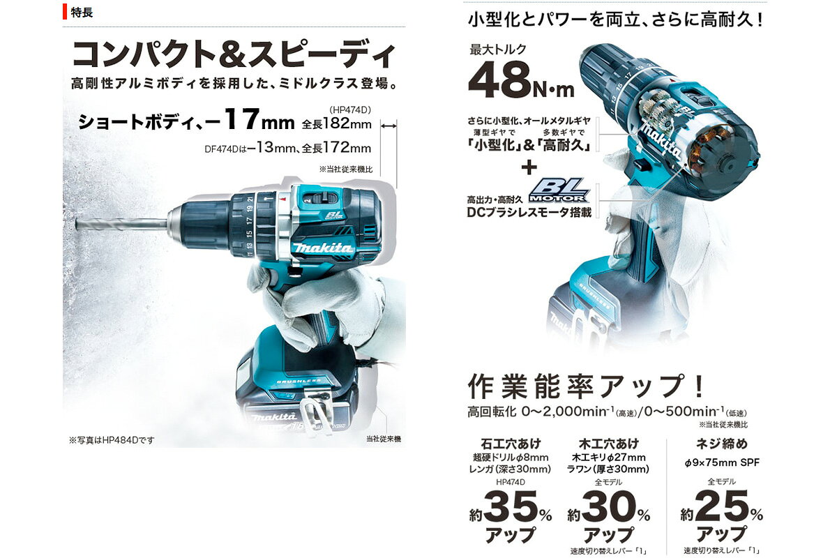 ■穴あけ能力:(コンクリート・ブロック)13mm、(鉄工)13mm、(木工)38mm ■ネジ締め能力:(木ネジ)径10×90mm、(小ネジ)M6 ■チャック能力:1.5〜13mm ■回転数[回/分]:(高速)0〜2,000、(低速)0〜500 ■打撃数[回/分]:(高速)0〜30,000、(低速)0〜7,500 ■全長:182mm ■質量:1.7kg(バッテリ含む) ■標準付属品:6.0AhリチウムイオンバッテリBL1460B×2台、充電器DC18RC、ケース、プラスビット2-65、フック