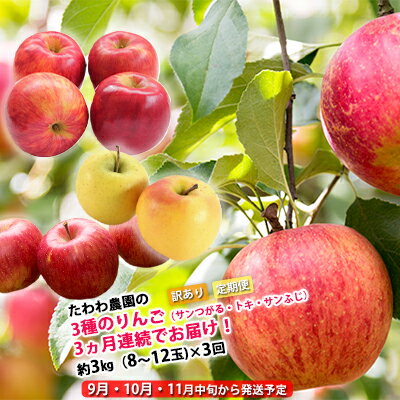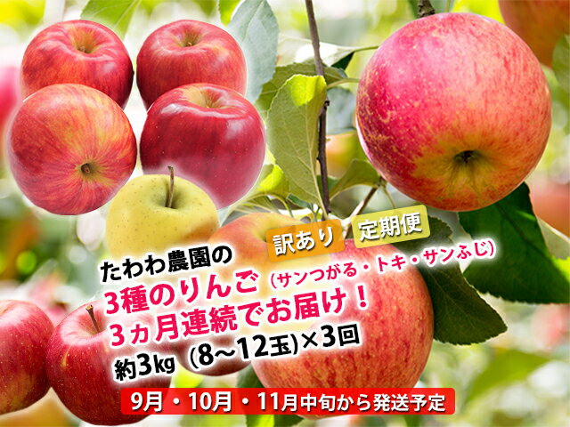 【ふるさと納税】【定期便】【訳あり】たわわ農園の3種のりんご(サンつがる・トキ・サンふじ)3ヵ月連続でお届け!約3kg(8〜12玉)×3回※9月・10月・11月発送予定※オンライン決済限定 【定期便・サンつがる・トキ・サンふじ】 お届け:2022年9月20日から発送予定