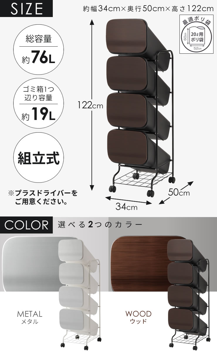 スタンドダストボックス 4P スムース(smoooth) / リス RISU 仕様 サイズ:約幅34cm×奥行50cm×高さ122cm 材 質:本体・フタ・袋止め/ポリプロピレン、フラップ/ABS樹脂、歯車・キャスター/ナイロン樹脂、フレーム/鋼(粉体焼付塗装)、ダンパー/ポリカーボネート・ポリアセタール・シリコーンオイル 内 容:ゴミ箱本体4個(各19L)、ワゴン1台 総容量:約76L(19L×4段) カラー:メタル(フレームと本体はホワイト)/ウッド(フレームと本体はブラック) 組立式:プラスドライバーをご用意ください。